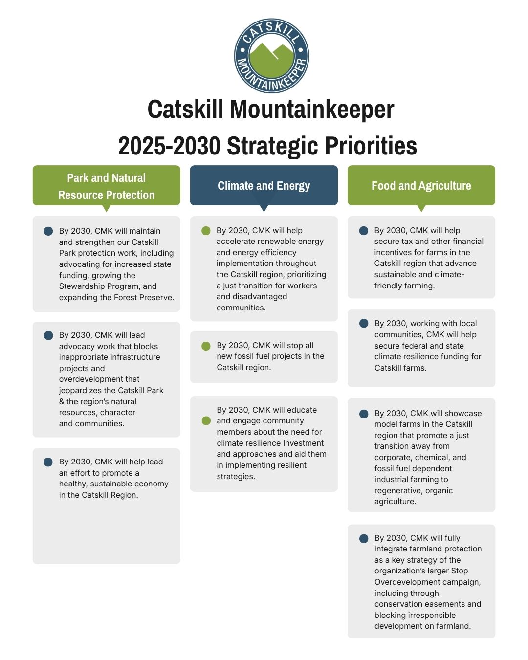 In 2024 Catskill Mountainkeeper embarked on a strategic planning process to strengthen the organization's ability to meet its mission. We are excited to share the following strategic priorities with you.